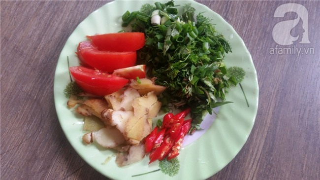 Riềng, ớt, cà chua, hành, rau răm, thì là rửa sạch, thái miếng và thái lát.