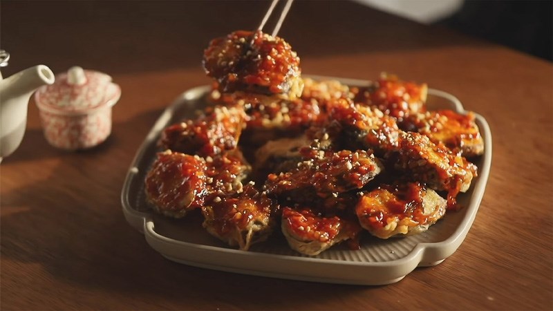 Món cà tím nhồi thịt chiên giòn sốt cay thật hấp dẫn với màu sắc bắt mắt là sự kết hợp giữa hương vị đậm đà, cay nồng của sốt, cà tím mềm, béo cùng với nhân thịt thơm ngon, thấm gia vị. Cắn vào một miếng là khoang miệng tràn ngập hương vị thơm lừng.