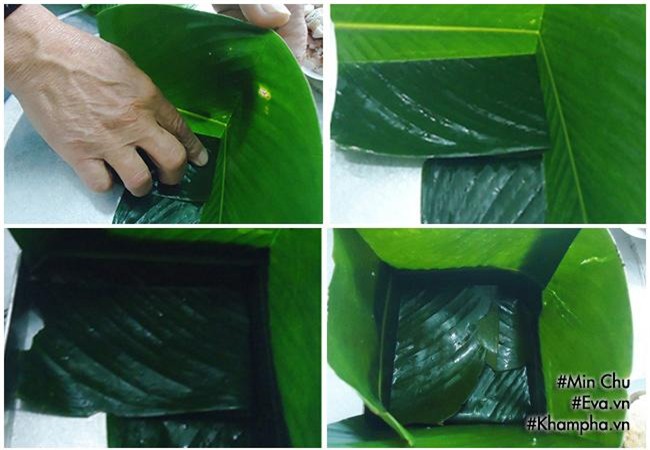 Bước 7: Sau khi xong phần nhân bánh, chúng ta gấp lá lại rồi dùng lạt buộc chặt bánh.