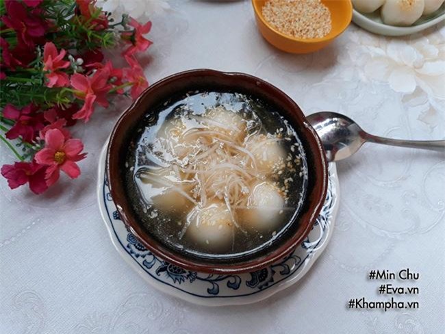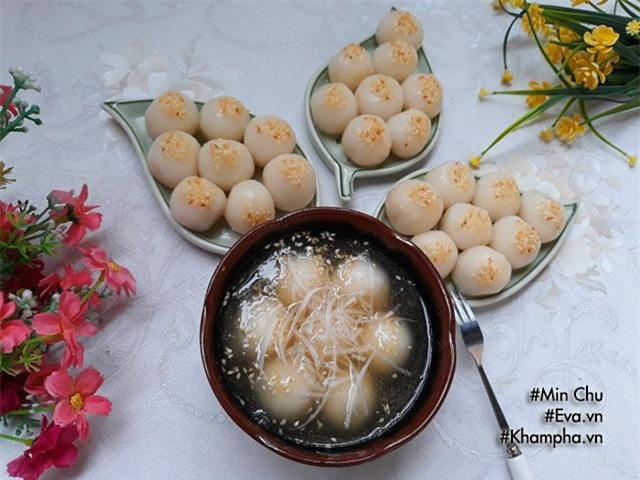 Cho bánh trôi ra đĩa, gạn hết nước đọng trên đĩa rồi dùng đầu ngón tay chấm vừng rang chấm lên trên mặt bánh trôi là xong.