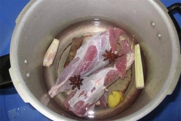- Bước 1: Cho bắp bò, hồi, quế, gừng đập dập vào nồi, đổ nước ngập thịt, thêm 1/2 muỗng cafe muối vào, nấu sôi, vớt bọt rồi để lửa liu riu luộc cho thịt mềm. Bâp bò ngâm mắm sẽ cứng lại nên khi luộc thịt, bạn nên luộc hơi nhừ chút nhé.