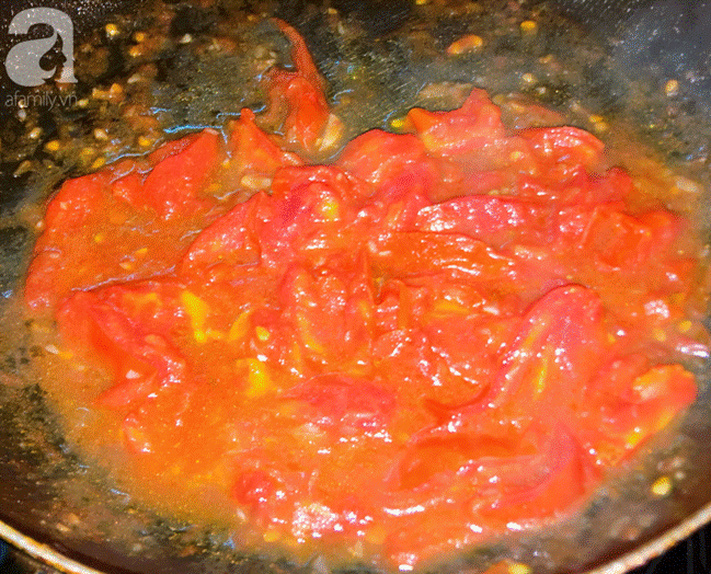 Phi thơm tỏi cho cà chua vào xào với 1/2 muỗng hạt nêm, 1/2 muỗng đường, xào đến khi cà chín mềm thì tắt bếp.