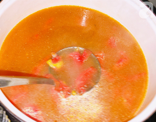Đun nóng lại nồi nước dùng rồi bỏ phần cà chua xào vào, nêm thêm đường, giấm, nước mắm, hạt nêm cho có vị chua ngọt thanh vừa miệng.