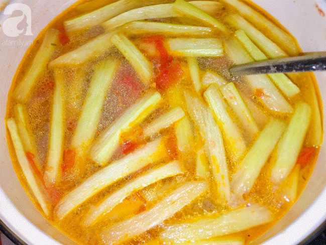 Khi nêm xong rồi bạn cho phần dọc mùng vào nấu thêm 3 phút và hạ lửa nhỏ nhất để nước dùng luôn nóng.