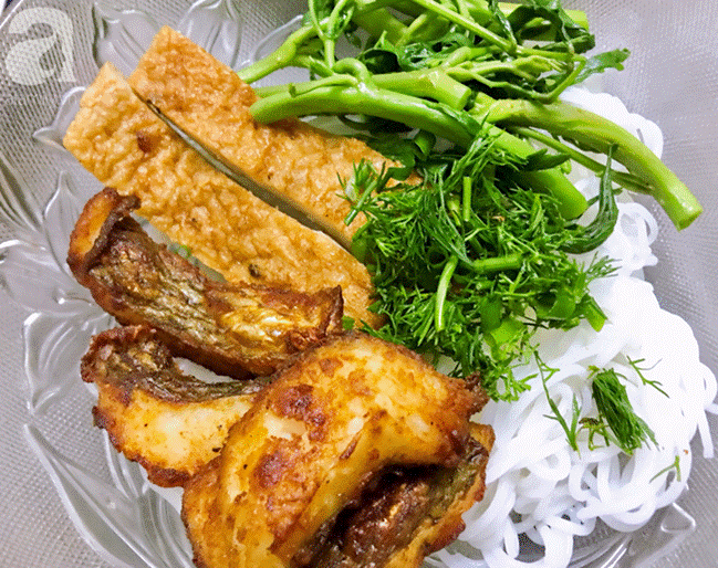 Trụng sơ bún qua nước sôi rồi cho ra tô, thêm cá chiên, chả cá thái miếng, rau nhút luộc, hành lá thì là.