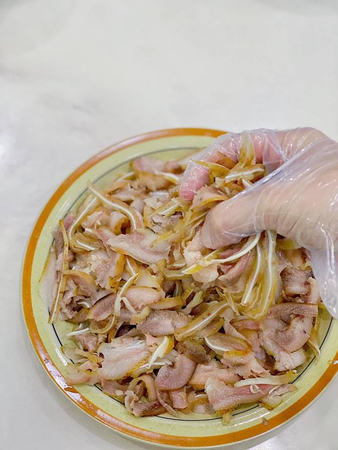 1 cái tai heo, 1 cái môi hoặc mũi heo rửa và làm sạch. Sau đó dùng khò để khò cho thơm.