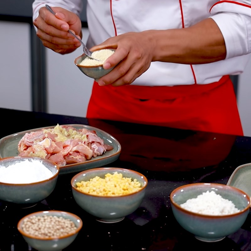 - Đun sôi chảo dầu, lần lượt lăn từng miếng gà qua phần bột năng khô rồi cho vào chảo chiên khoảng 5 - 7 phút đến khi gà chín vàng.