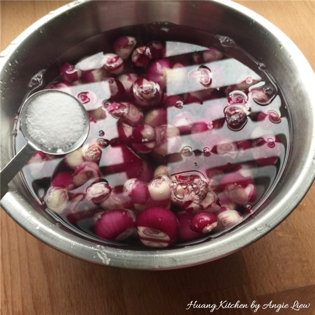 Gọt bỏ vỏ hành, ngâm hành vào trong nước muối khoảng 30 phút. Muối sẽ giúp hành phi có vị ngon hơn và giữ được độ giòn khi chiên.