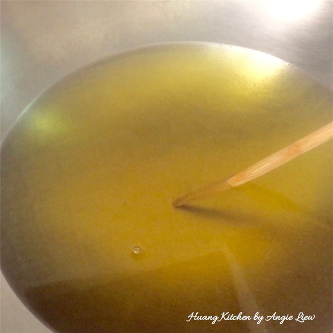 Cho dầu vào chảo sâu lòng, để ở lửa vừa, kiểm tra độ nóng của dầu bằng cách cho đầu đũa vào thấy bong bóng bám xung quanh đầu đũa là được.
