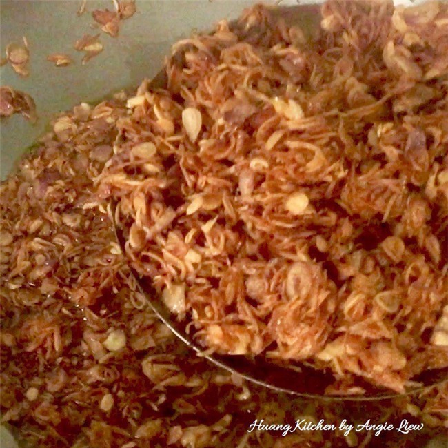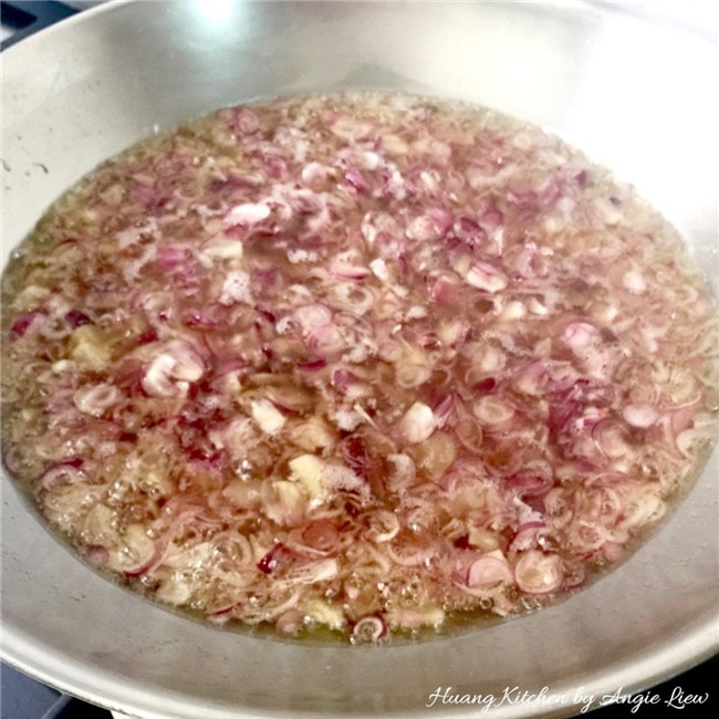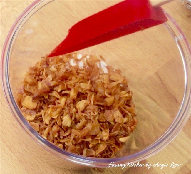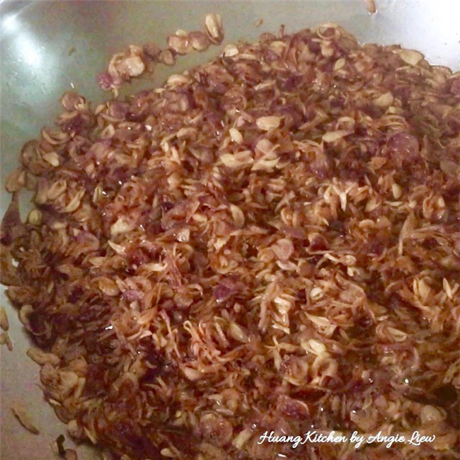 Khi bắt đầu thấy hành vàng thì tắt bếp, vẫn tiếp tục đảo đến khi hành chuyển màu cánh gián.