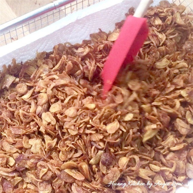 Nhanh tay nhấc hành ra khỏi bếp vừa đun, dùng muỗng thủng vớt hành ra một khay rộng đã lót sẵn giấy thấm dầu.