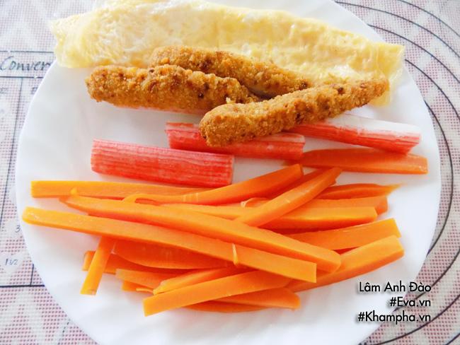 - Sau đó cho thanh cua + thịt gà chiên + cà rốt và trứng chiên chín giữa. Nhẹ nhàng cuộn tròn, để qua 1 bên.