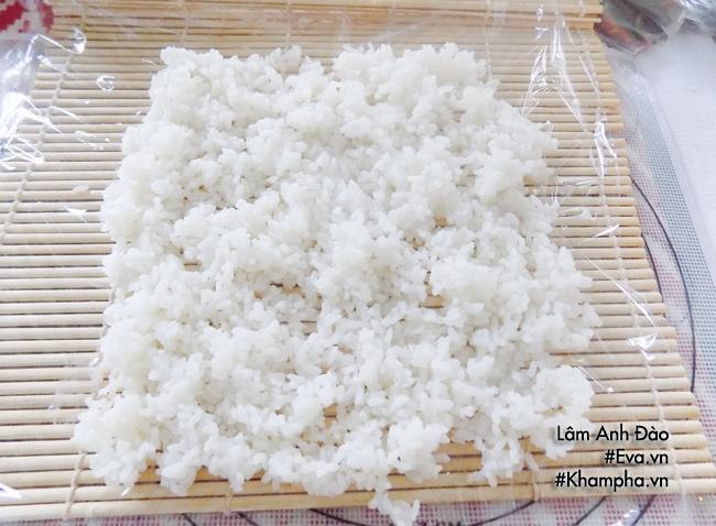 - Trải lá rong biển lên vỉ cuốn sushi, dàn 1 lớp cơm.