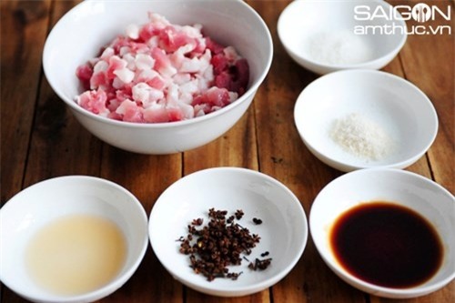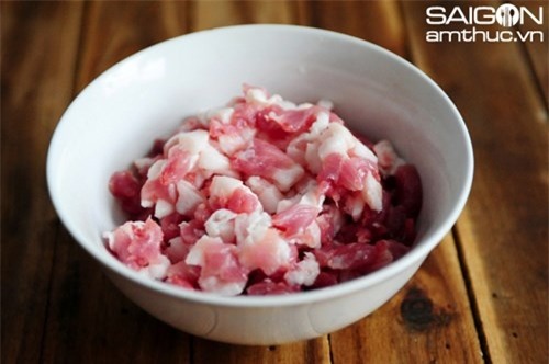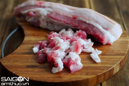 - Thịt ba chỉ lọc bỏ bì, rửa sạch rồi tráng qua với 100ml rượu trắng. Sau đó thái miếng nhỏ, mỏng hoặc thái hạt lựu.