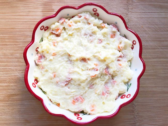 Đổ xúc xích, cà rốt vào phần khoai tây nghiền, trộn đều.