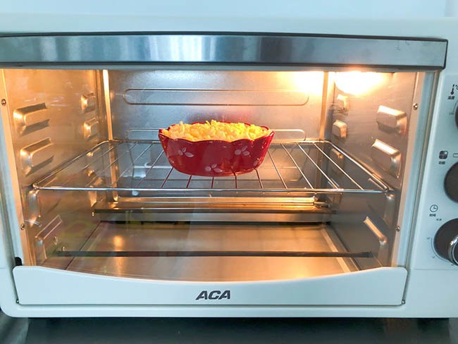 Làm nóng lò ở 200 độ C tầm 10 phút trước khi nướng. Nướng khoai trong 20 phút đến khi phô mai tan chảy và bề mặt chuyển sang màu vàng nâu.