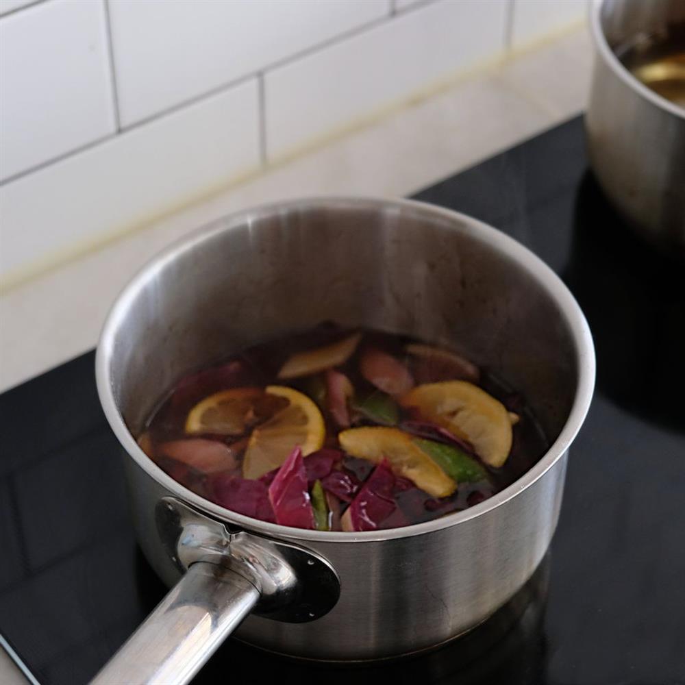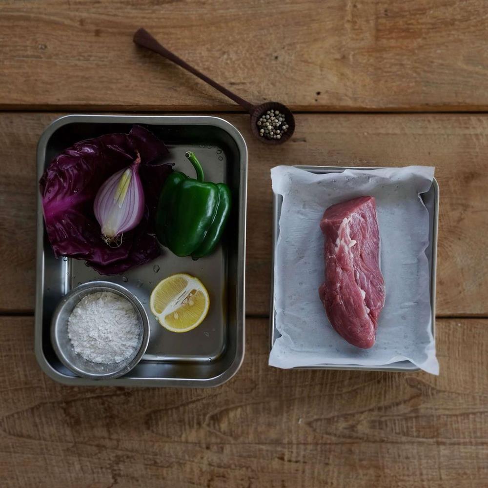 BƯỚC 2: Cắt ớt xanh, hành tím và cải bắp tím thành miếng vừa ăn. Chanh cắt thành từng lát mỏng và chia đôi.