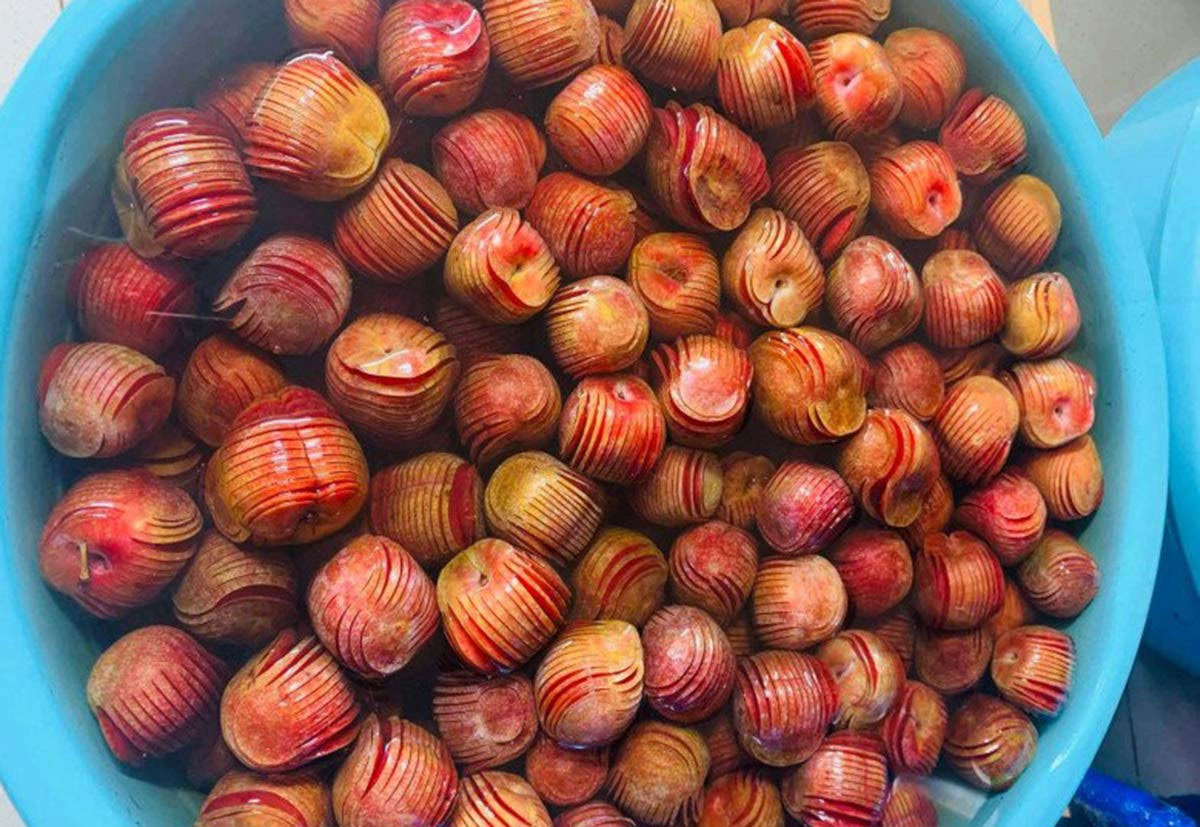 Khâu khứa mận khá quan trọng. Chúng sẽ quyết định đến hình dáng miếng mứt mận có đều, đẹp hay không. Khứa theo chiều dọc, ngang hay chéo đều được.