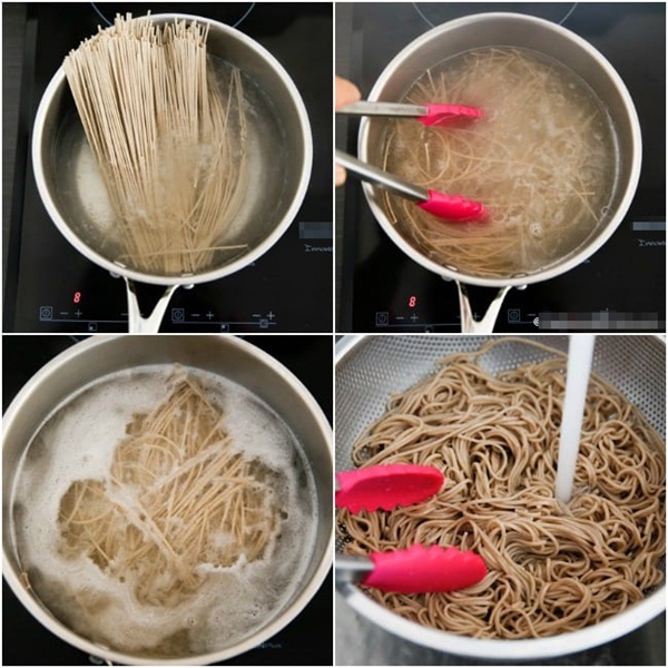 1. Luộc mì trong nước sôi theo hướng dẫn trên bao bì. Sau khi mì chín mềm lấy ra, dội một ít nước lạnh lên mì để làm nguội.