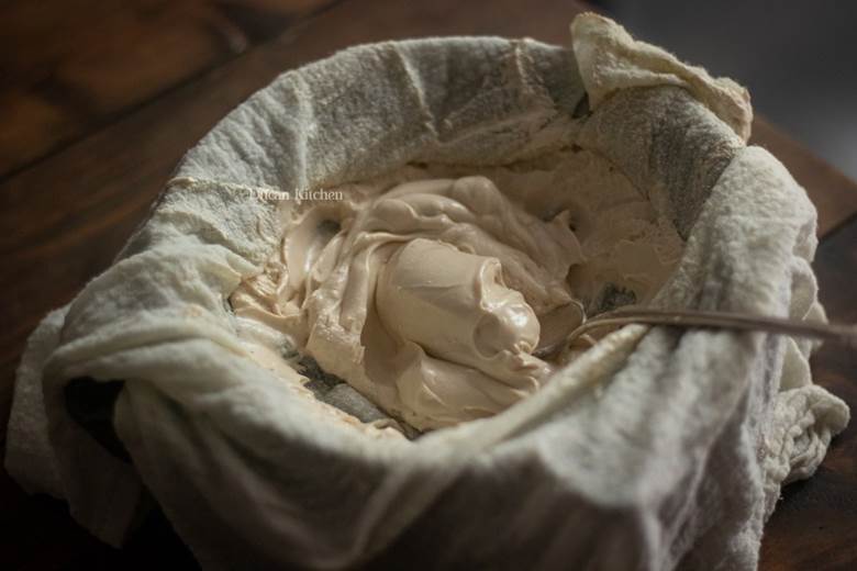 8. Bạn chuẩn bị một tô lớn, cho rây kim loại lên trên, sau đó cho một khăn vải lên trên rây rồi cho sữa chua vào, gói gém lại, sau đó để sữa chua lọc trong tủ lạnh khoảng 5-6 tiếng là sẽ có sữa chua Hy Lạp dẻo quánh thơm ngon. Tuỳ vào kết cấu bạn thích như nào thì bạn có thể điều chỉnh thời gian sao cho phù hợp. Sau 5-6 tiếng, gần như phần nước có trong sữa chua đậu nành đã ra gần hết rồi, thành phẩm sữa chua Hy Lạp rất quyện.