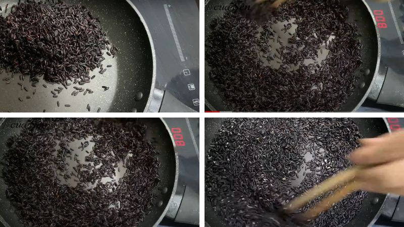 Đầu tiên, vo nhẹ 150g gạo lứt đen để loại bỏ bụi bẩn sau đó để ráo nước rồi mang đi rang.