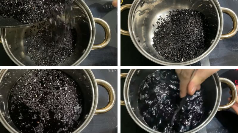 Cho gạo lứt đen đã rang vào nồi cùng 300ml nước sôi để nguội sau đó đun trong vòng 5 phút. Khi nồi nước gạo sôi, hãy khuấy nhẹ để gạo không bị dính vào đáy nồi rồi vớt ra.