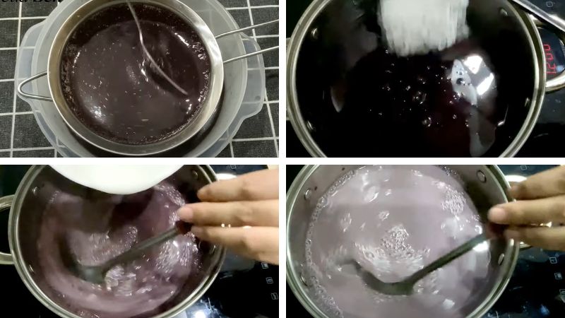 Cho vào nồi phần nước gạo lứt đen vừa lọc cùng 200g đường rồi khuấy thật đều để đường tan. Sau khi hỗn hợp nước gạo lứt cùng đường đã hòa tan và nóng lên thì tắt bếp rồi cho từ từ 500ml sữa tươi không đường vào nồi (vừa đổ vừa khuấy đều). Cần lưu ý không cho sữa vào lúc đang đun sôi vì sẽ làm mất đi chất dinh dưỡng trong sữa.