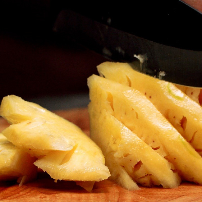 Dứa gọt vỏ, cắt mắt rồi rửa sạch với nước và thái vát thành miếng mỏng.