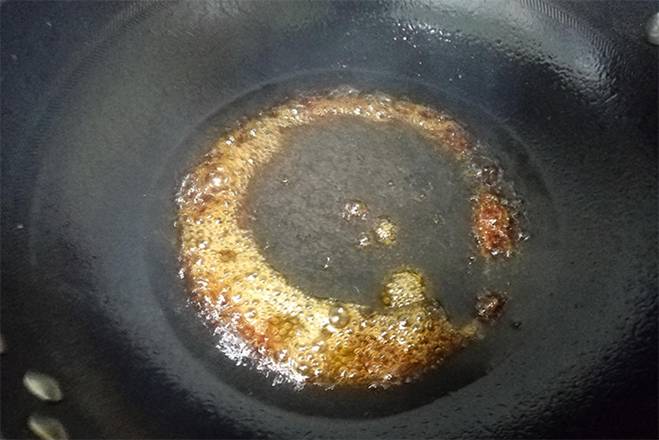 Đun nóng dầu ăn trong chảo, cho đường phèn vào xào trên lửa nhỏ cho đến khi đường chuyển sang màu nâu. Khi đường phèn tan, chuyển sang màu nâu và sủi bọt dày đặc là đã sẵn sàng để sang bước tiếp theo.