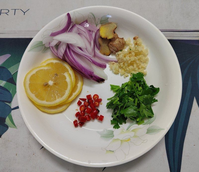 Bước 1: Chanh thái lát, hành tây bóc bỏ vỏ rồi thái lát, rau mùi và ớt rửa sạch sau đó thái nhỏ, gừng rửa sạch thái lát, tỏi băm nhỏ.
