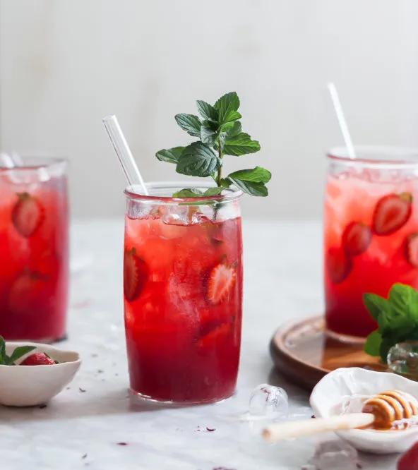 Bụp giấm khô - 4 thìa, dâu tây - 6 quả, 1 vài nhánh lá bạc hà (có thể thêm 1 muỗng lá trà bạc hà khô), nước cốt nửa quả chanh, mật ong hoặc xi rô cây phong, đá viên.