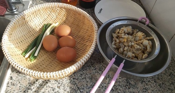 | Trứng sống: 4 quả Ngao: 250 gam Hành lá Dầu thực vật Hạt tiêu |