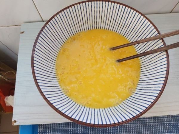 2. Đập trứng sống ra bát, rồi dùng đũa khuấy đều.