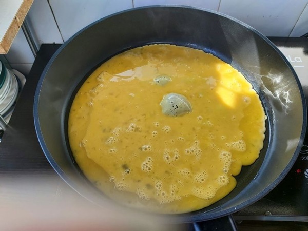 4. Đổ trứng sống đã đánh tan vào chảo, đảo chiên cho đến khi chín.