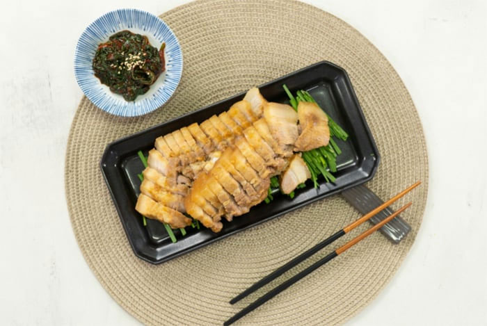 Món thịt ba chỉ luộc không cần nước không chỉ có vị đậm đà do chất đạm ít bị thôi ra nước luộc mà còn có thêm vị ngọt, hương thơm của táo, hành tây cũng như các loại lá gia vị. Bạn có thể kết hợp món này với các loại rau dưa, kim chi.