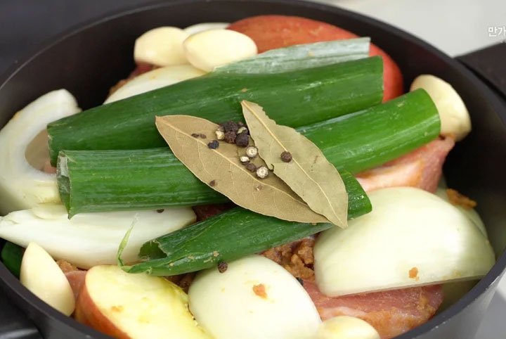 Dùng hành tây và táo lót xuống đáy nồi, sau đó cho thịt ba chỉ vào rồi thêm các gia vị như tỏi, hành lá, tiêu, lá nguyệt quế.
