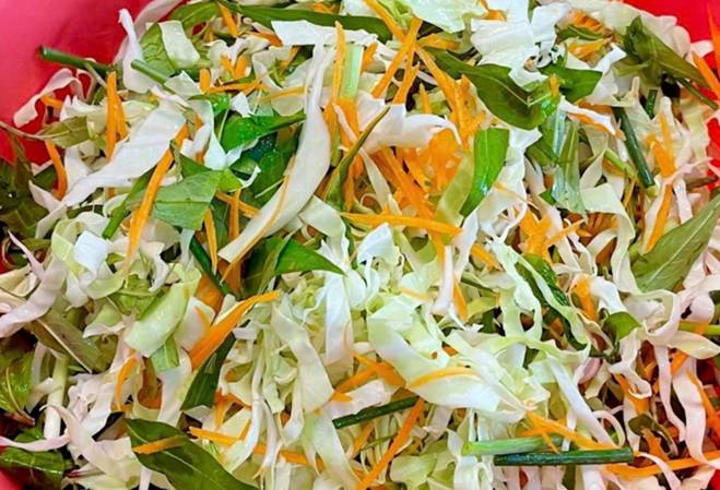 Bạn trộn bắp cải, cà rốt lại với nhau và phơi qua nắng cho héo khoảng 1 tiếng đồng hồ.