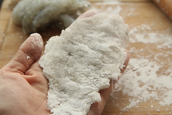 4. Dùng thớt cán đều tôm để tôm được mỏng mềm và thấm bột.