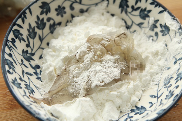 3. Chuẩn bị một bát bột ngô, cho tôm vào.