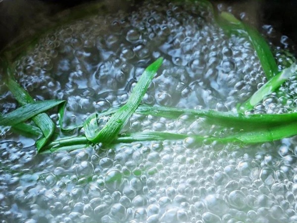 Bước 3: Đun một nồi nước sôi, cho 1 thìa nhỏ dầu ăn vào. Nhúng lá cải thảo vào chần cho mềm nhanh tay, sau đó, làm tương tự với lá hành. Không nên chần lâu quá sẽ khiến cải và hành bị thâm màu.