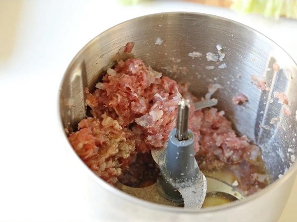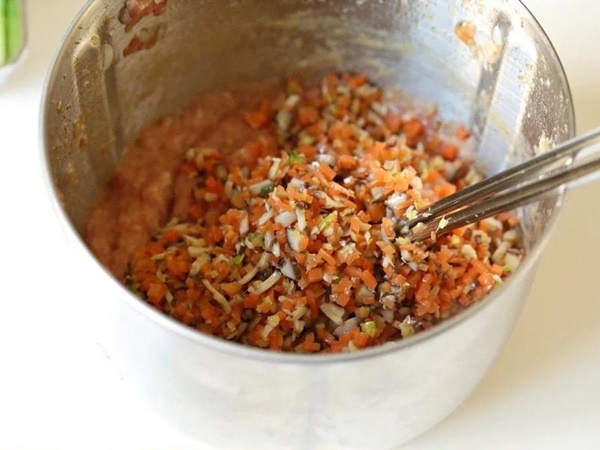Bước 4: Tôm và thịt băm xay nhuyễn cùng nhau. Sau đó, thêm trứng, nước, nước tương, muối, rượu nấu ăn, tiêu, dầu ăn vào trộn đều khoảng 15 giây. Đổ cà rốt và nấm hương đã xào vào, dùng đũa trộn đều.