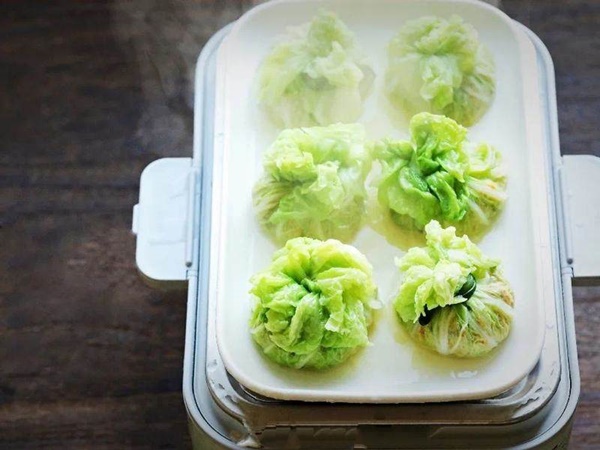 Bước 5: Sau khi chuẩn bị phần nhân, trải phẳng lá cải thảo, múc một lượng nhân vừa phải ra đặt vào giữa phần lá cải thảo. Dùng cọng hành chần mềm buộc lại, có thể thắt nơ cho đẹp. Làm tương tự đến khi hết nguyên liệu.