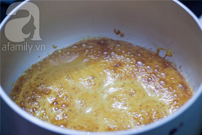 Cho 7 thìa đường và 2 thìa nước lọc vào nồi khuấy đều đến khi đường chuyển màu cánh gián.