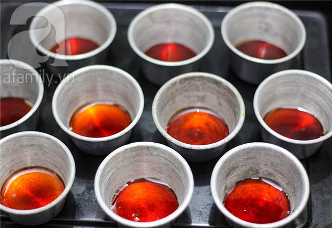 Đổ caramen vào cốc nhỏ, tráng đều để caramen phủ kín một lớp mỏng ở đáy cốc.
