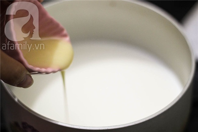 Đổ từ từ trứng vào nồi sữa khuấy đều. Rây lại một lần nữa cho hỗn hợp được mịn.
