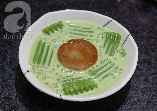 Đổ caramen ra bát, thêm bột báng, thạch trà xanh và trà sữa vào bát, ăn kèm với đá bào sẽ ngon hơn nhé!