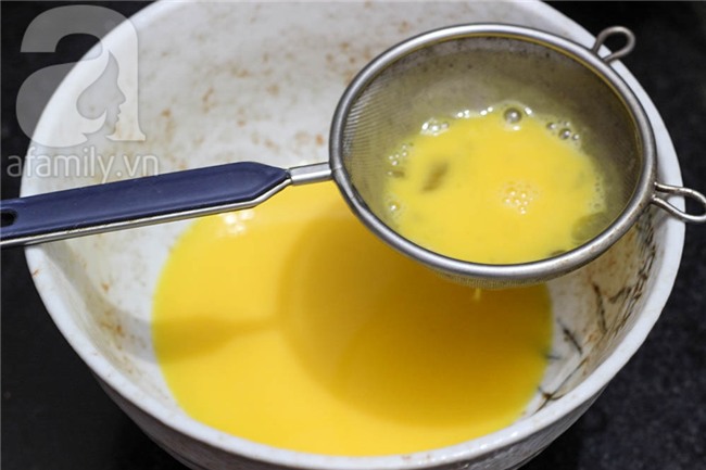 Dùng rây lọc hỗn hợp trứng đánh tan cho mịn.