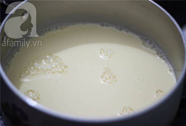 Đổ 400ml sữa tươi và 2 thìa sữa đặc vào nồi khuấy đều cho tan. Đun đến khi hỗn hợp nổi bọt lăn tăn ở thành nồi thì tắt bếp, để cho nguội bớt.