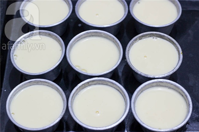 Múc hỗn hợp trứng sữa vào cốc vừa đổ caramen.