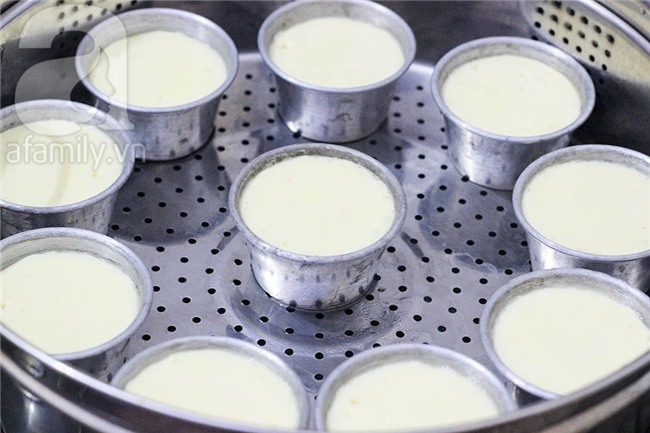 Cho caramen vào nồi hấp ở lửa nhỏ, dùng một tấm vải lớn phủ kín vung nồi để tránh làm hơi nước rơi vào bánh. Cứ 5 phút lại mở nắp một lần để tránh hơi nước quá nóng sẽ làm sôi trứng sữa.